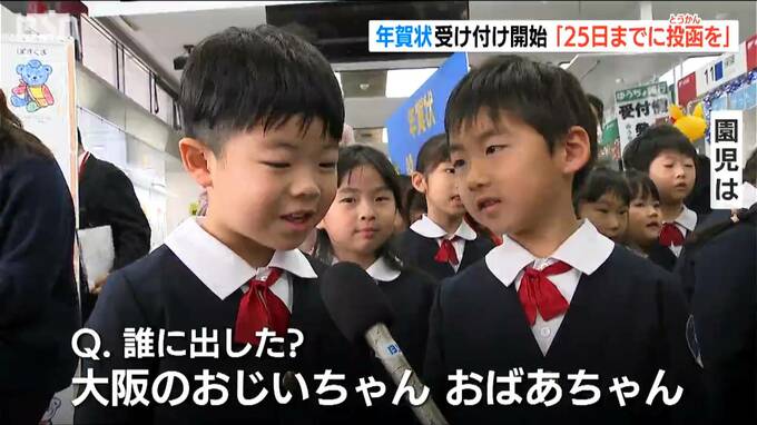 地元こども園の園児の歌声でスタートした年賀状の受け付け。