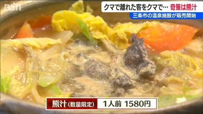 三条市下田地域にある日帰り温泉施設『いい湯らてい』の施設内の食堂で13日から販売が始まったのは、クマ肉が入ったあったかい『熊汁』。