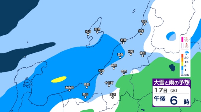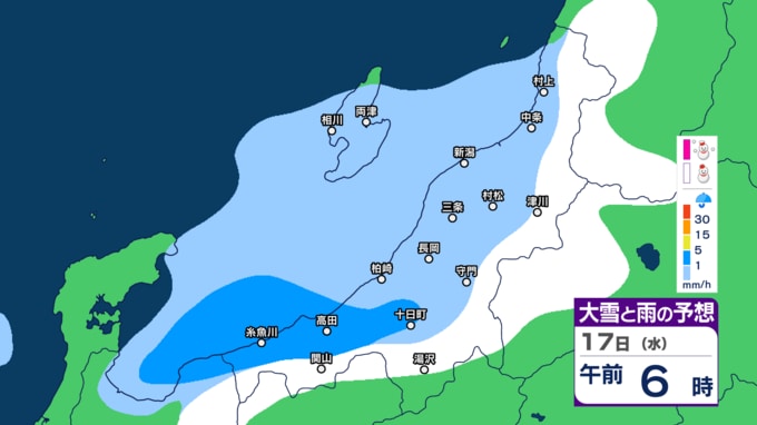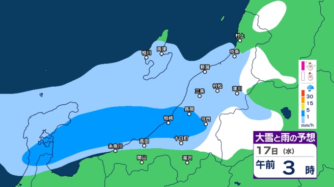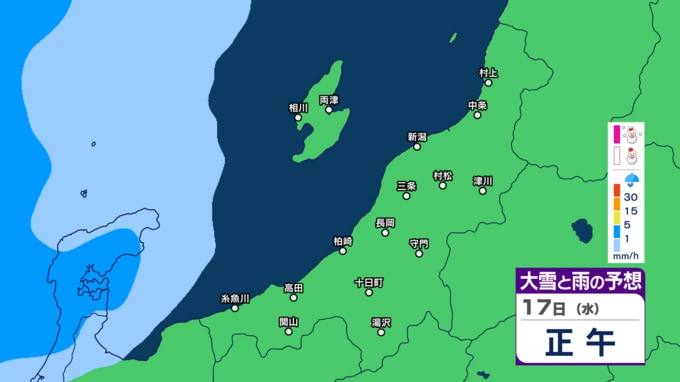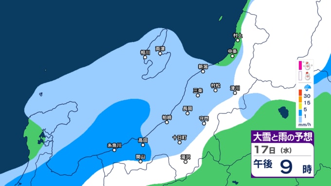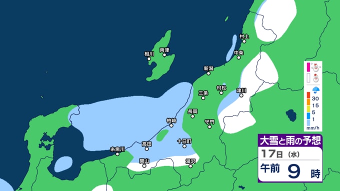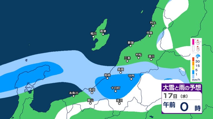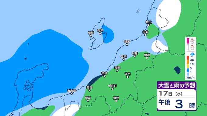 あす17日にかけて新潟県内は雨や雪となる所も 19日(金)・20日(土)は晴れて気温が上がる?【今後の雨と雪のシミュレーション・16日午前10時更新】 2025年12月16日(火) 10:07 17日(水)の雨と雪のシミュレーション(3時間ごと)