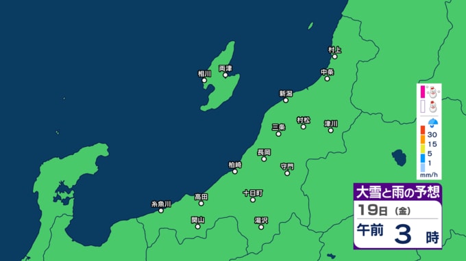 あす17日にかけて新潟県内は雨や雪となる所も 19日(金)・20日(土)は晴れて気温が上がる?【今後の雨と雪のシミュレーション・16日午前10時更新】 2025年12月16日(火) 10:07 19日(金)午前0時~午後3時の雨と雪のシミュレーション(3時間ごと)