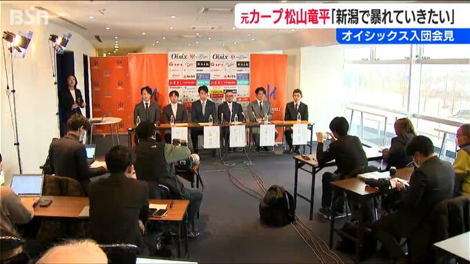 オイシックス新潟アルビレックス・ベースボール・クラブに入団が決まった元広島東洋カープの“打撃職人”松山選手らが、16日にHARD OFF ECOスタジアム新潟で会見に臨み、「新潟で暴れていきたい」と今シーズンの活躍を誓いました。