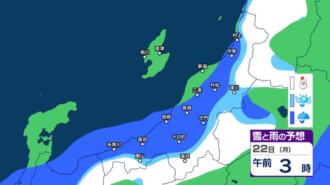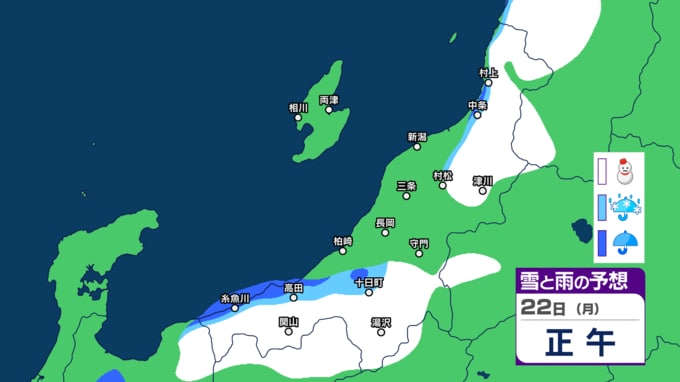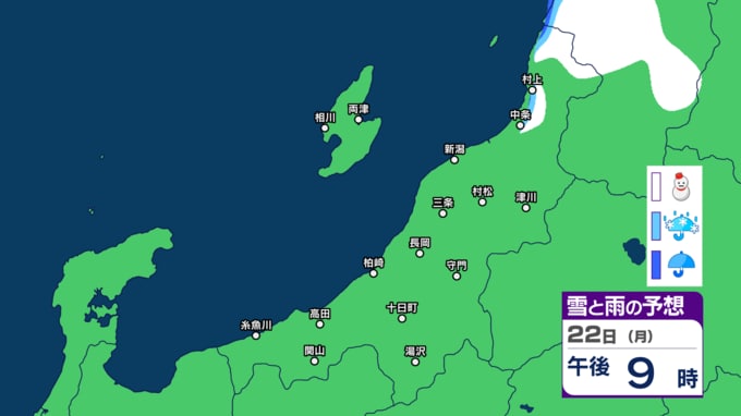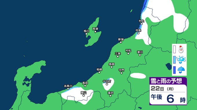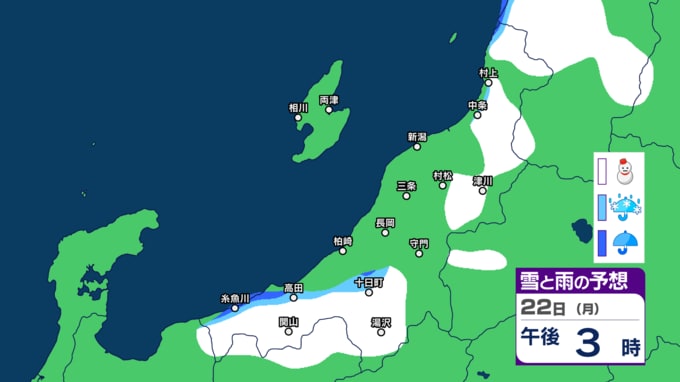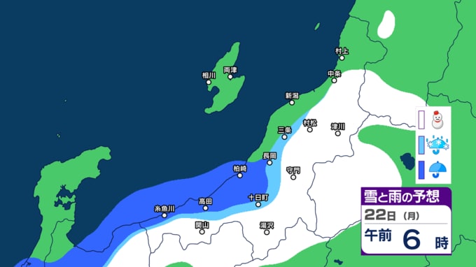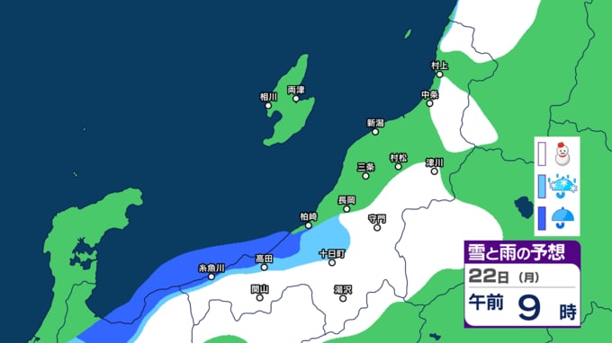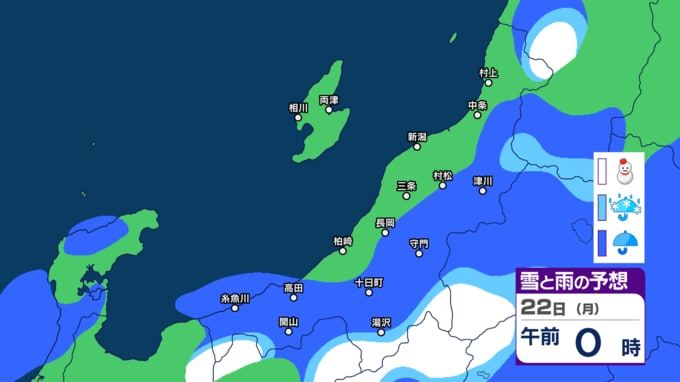 上越21℃、長岡18℃、新潟で17℃など20日の新潟県内は気温が高い状態に 21日は次第に雨の予報【今後の雨と雪のシミュレーション・20日午前11時更新】 2025年12月20日(土) 11:00 22日(月)の雨と雪のシミュレーション