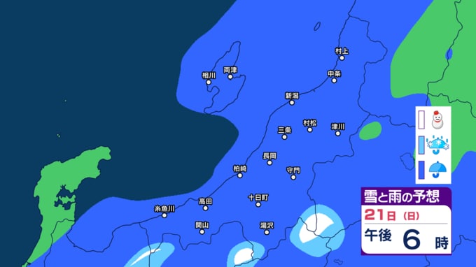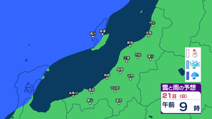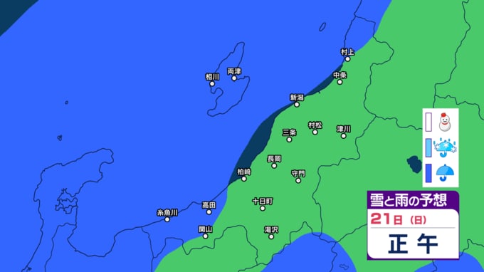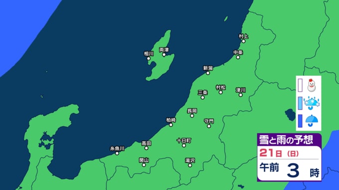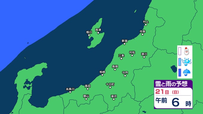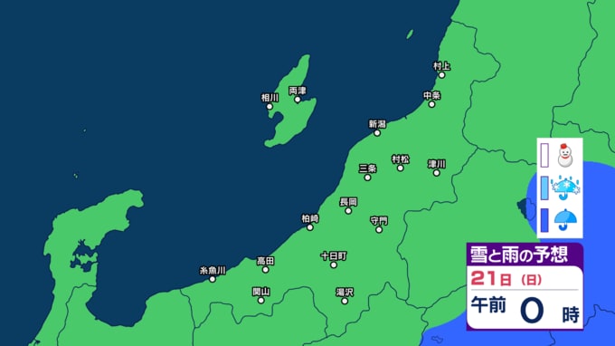 あす21日の新潟県内は次第に雨の見込み 前線通過後に寒気流れ込み22日(月)は山沿いなどで雪の所も?【今後の雨と雪のシミュレーション・20日午後8時更新】 2025年12月20日(土) 20:00 21日(日)の雨と雪のシミュレーション