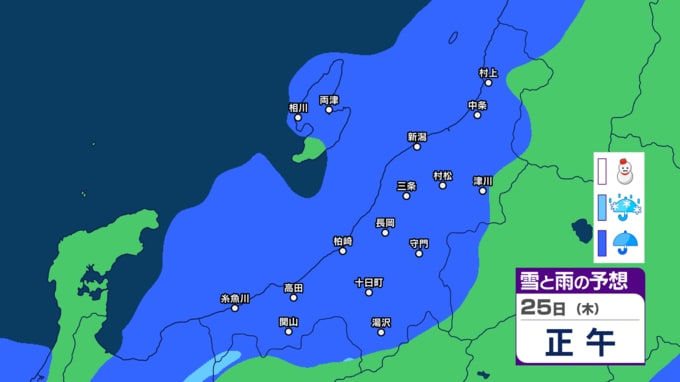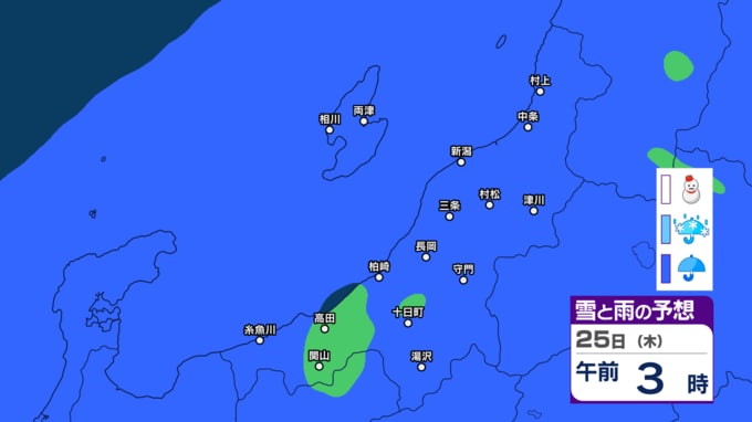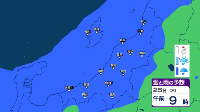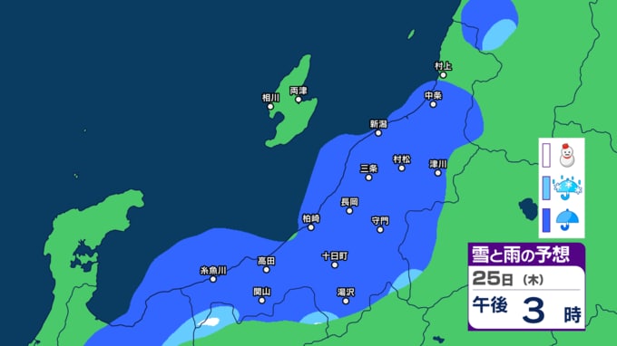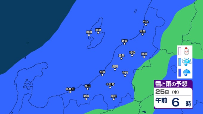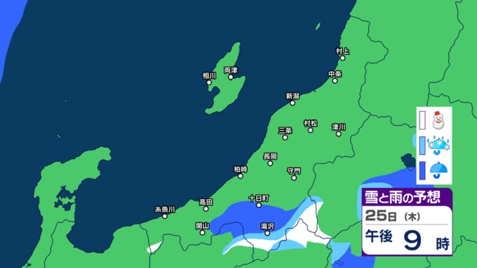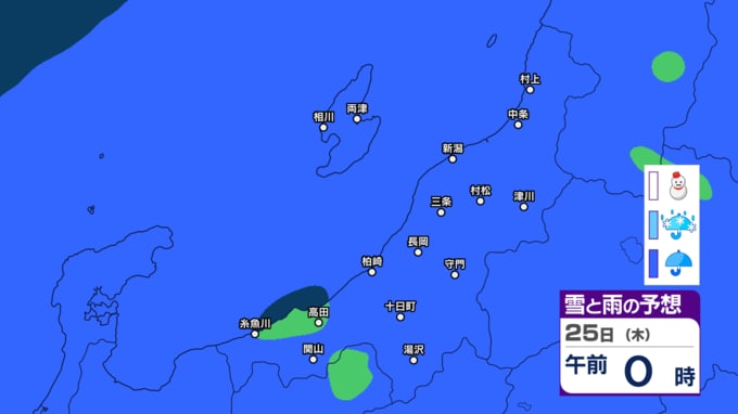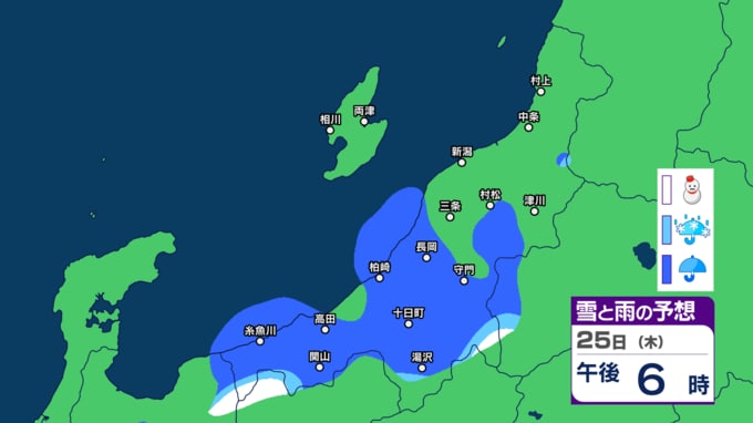 あす21日の新潟県内は次第に雨の見込み 前線通過後に寒気流れ込み22日(月)は山沿いなどで雪の所も?【今後の雨と雪のシミュレーション・20日午後8時更新】 2025年12月20日(土) 20:00 25日(木)の雨と雪のシミュレーション