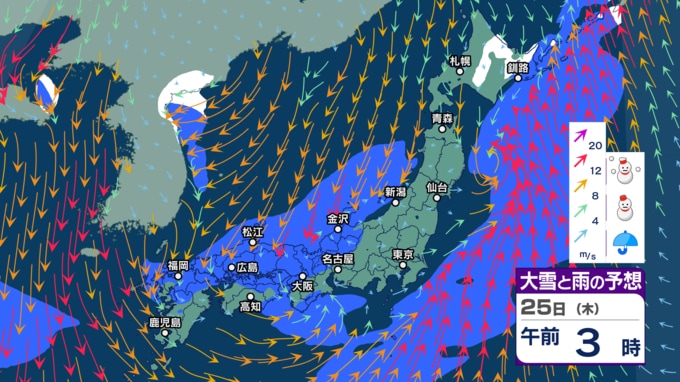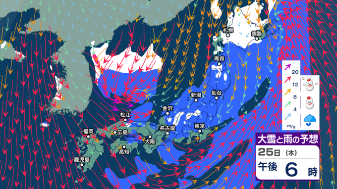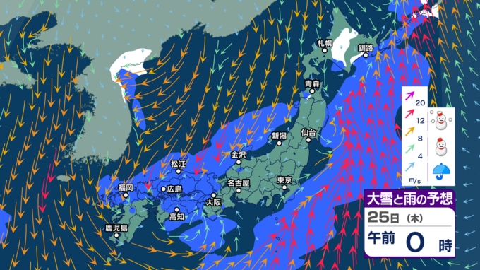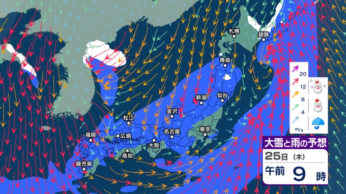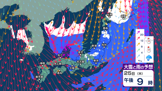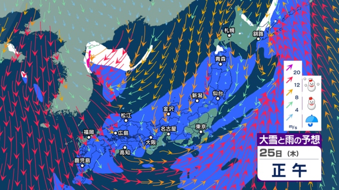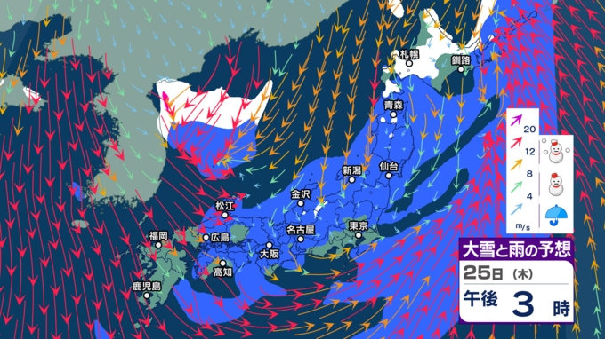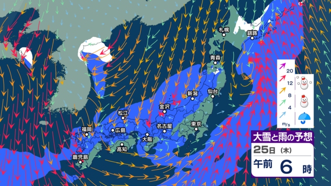 “雨のクリスマス”の後は寒気にすっぽり 北~西日本で荒れた天気となり大雪に? 大荒れや警報級大雪の恐れ【今後の雨と雪のシミュレーション・24日正午更新】 2025年12月24日(水) 12:00 25日(木)の雨と雪のシミュレーション