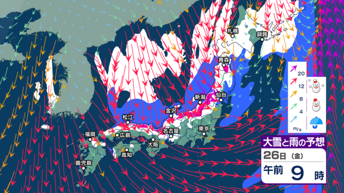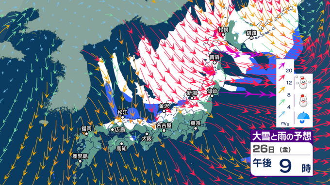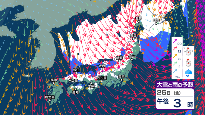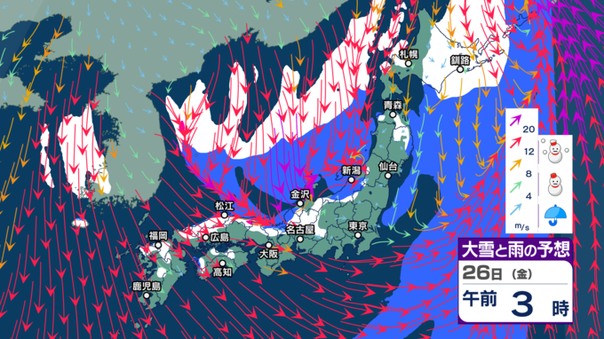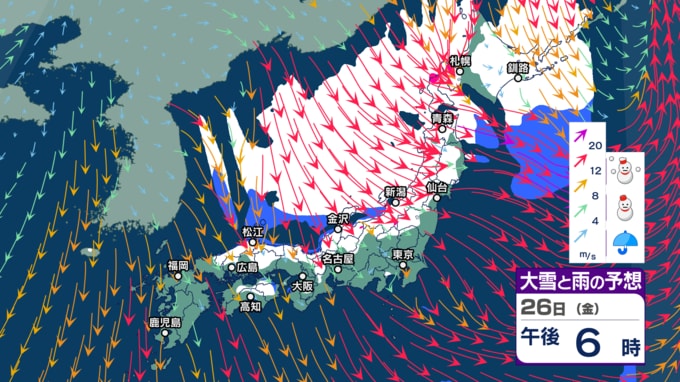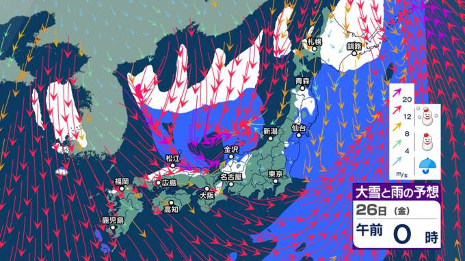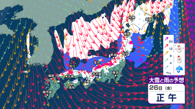 “雨のクリスマス”の後は寒気にすっぽり 北~西日本で荒れた天気となり大雪に? 大荒れや警報級大雪の恐れ【今後の雨と雪のシミュレーション・24日正午更新】 2025年12月24日(水) 12:00 26日(金)の雨と雪のシミュレーション