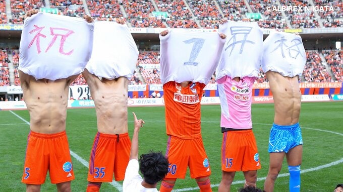 また、2022年のJ1昇格決定時、試合後のセレモニーで着用した「祝J1昇格」と手書きされたTシャツのエピソードも。実はこれ、千葉選手が前日に自ら量販店で購入し準備していたものでした。