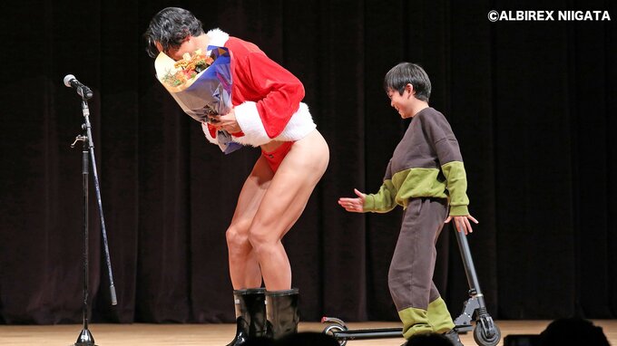 ステージにはU-18の選手たちが登壇。赤いパンツ一丁の姿で未来のアルビ戦士たちと並んで写真に収まる光景は、シュールでありながらも、確かなバトンの継承を感じさせるものでした。
