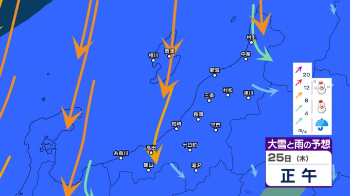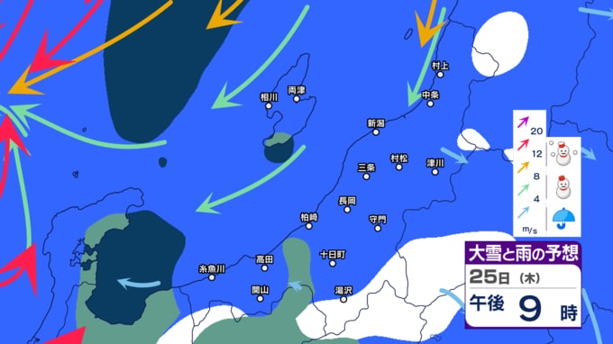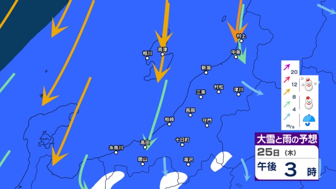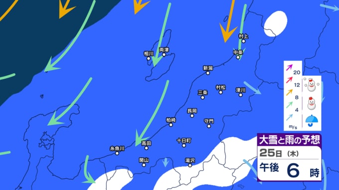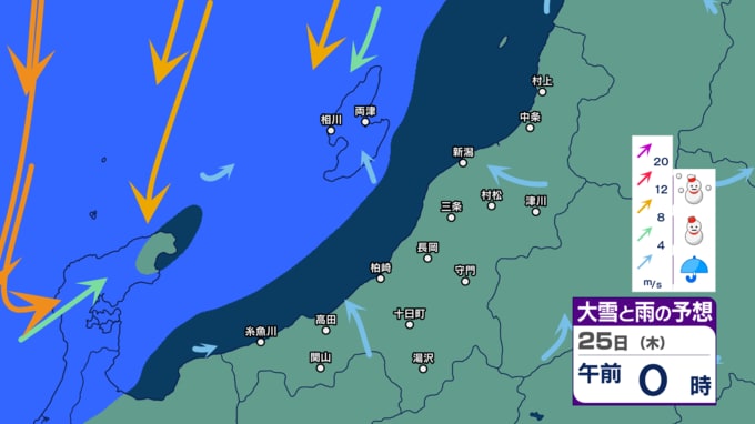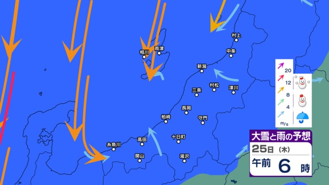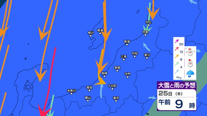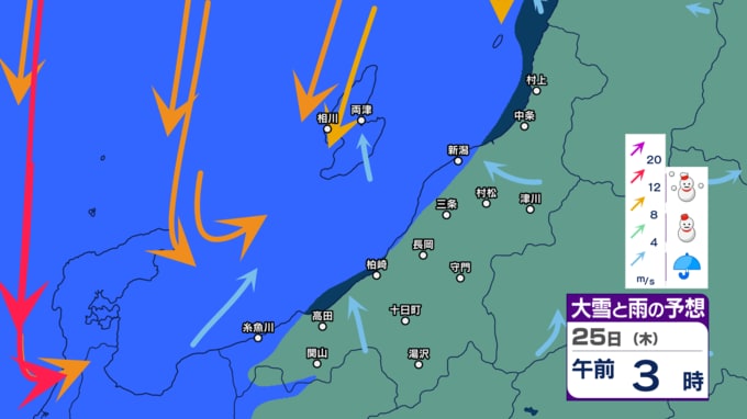 【警戒】新潟県内は26日にかけて荒れた天気に 暴風や高波に警戒 大雪にも注意・警戒を 24時間降雪量は最大50cm予想【今後の雨と雪のシミュレーション・24日午後9時更新】 2025年12月24日(水) 21:02 25日(木)の雨・雪と風のシミュレーション