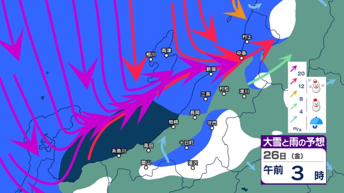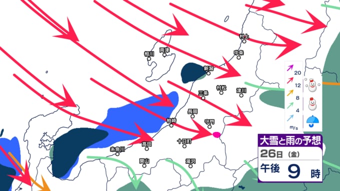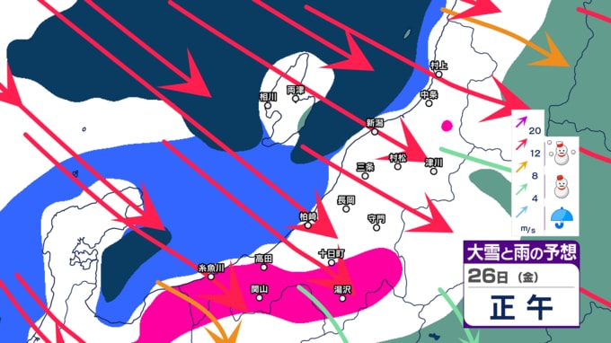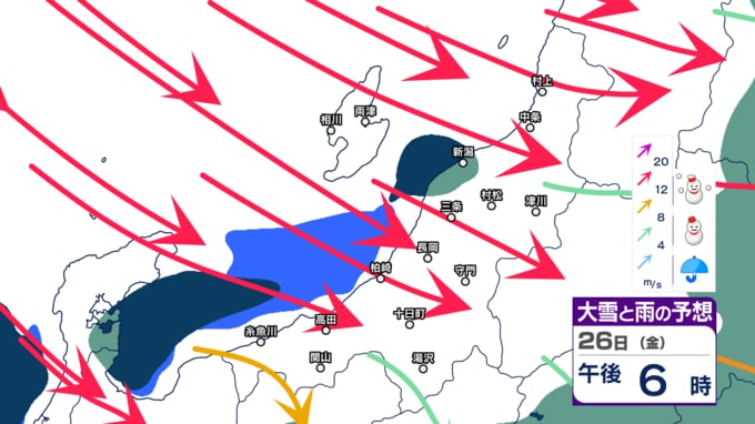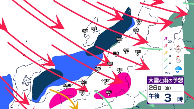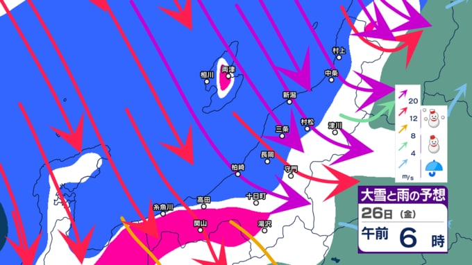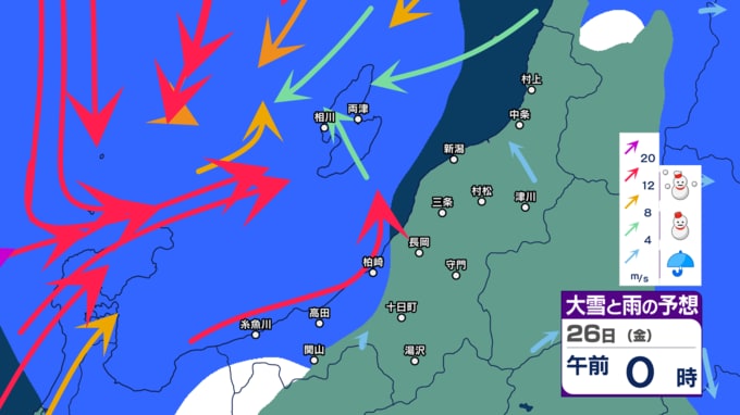 【警戒】新潟県内は26日にかけて荒れた天気に 暴風や高波に警戒 大雪にも注意・警戒を 24時間降雪量は最大50cm予想【今後の雨と雪のシミュレーション・24日午後9時更新】 2025年12月24日(水) 21:02 26日(金)の雨・雪と風のシミュレーション