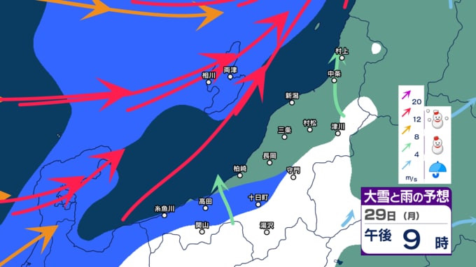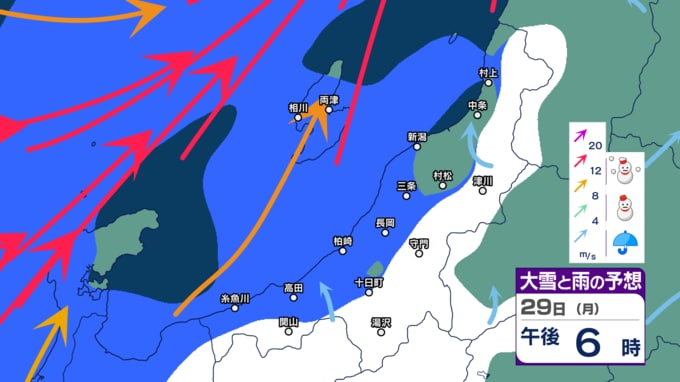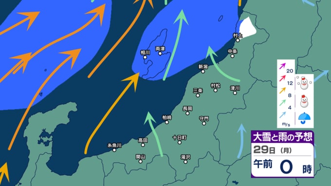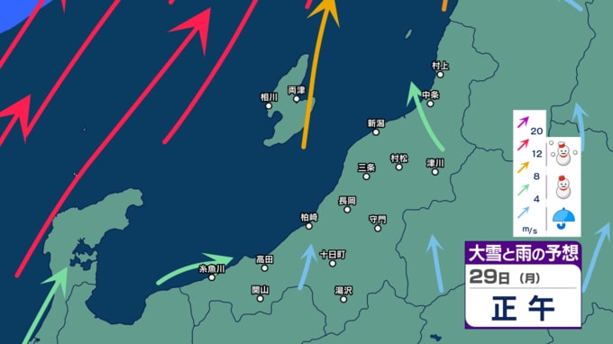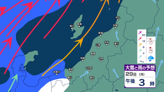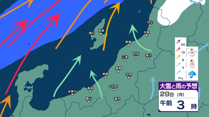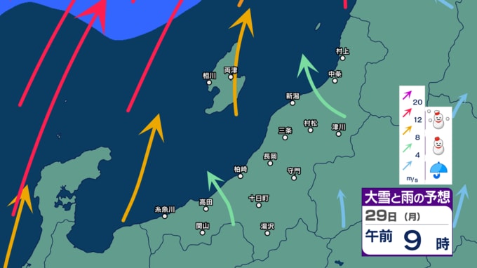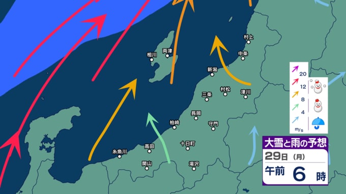 【警戒】新潟県内は26日にかけて荒れた天気に 暴風や高波に警戒 大雪にも注意・警戒を 24時間降雪量は最大50cm予想【今後の雨と雪のシミュレーション・24日午後9時更新】 2025年12月24日(水) 21:02 29日(月)の雨・雪と風のシミュレーション