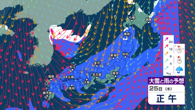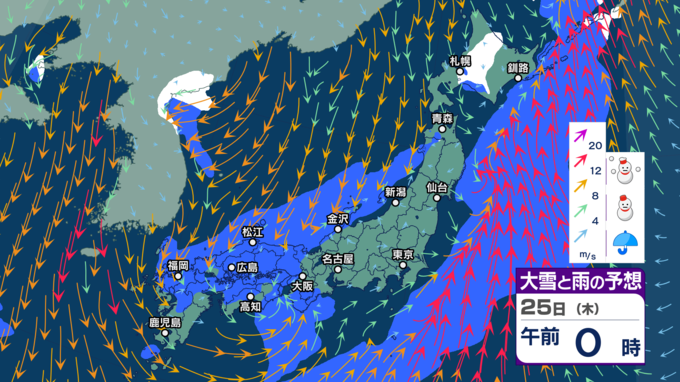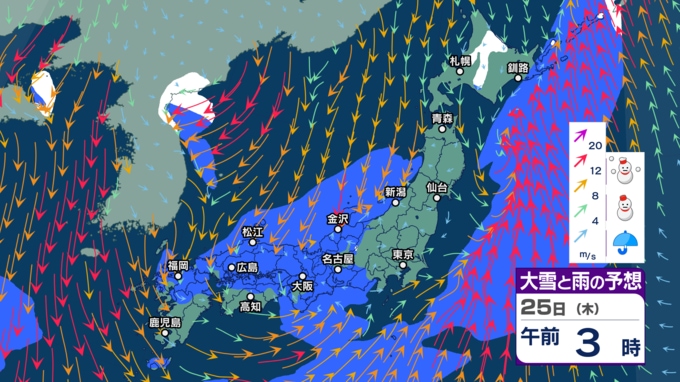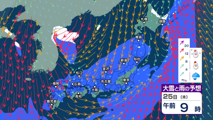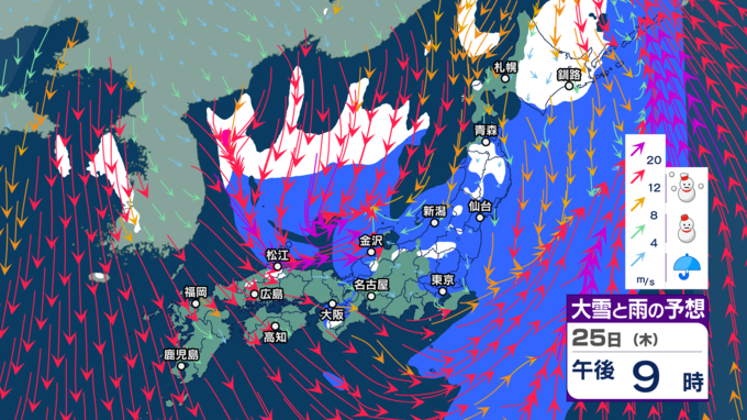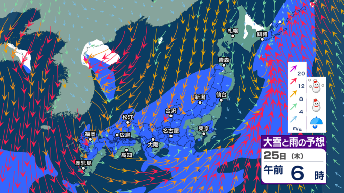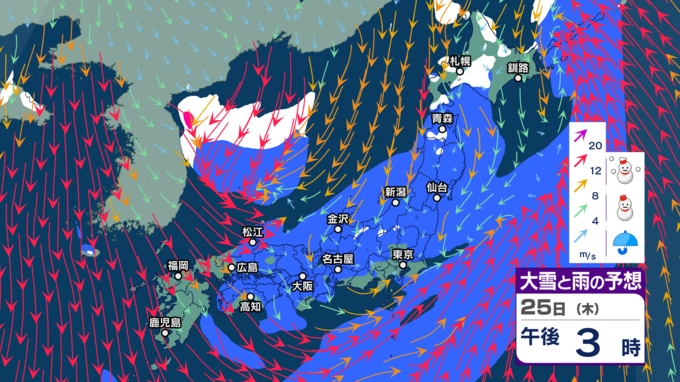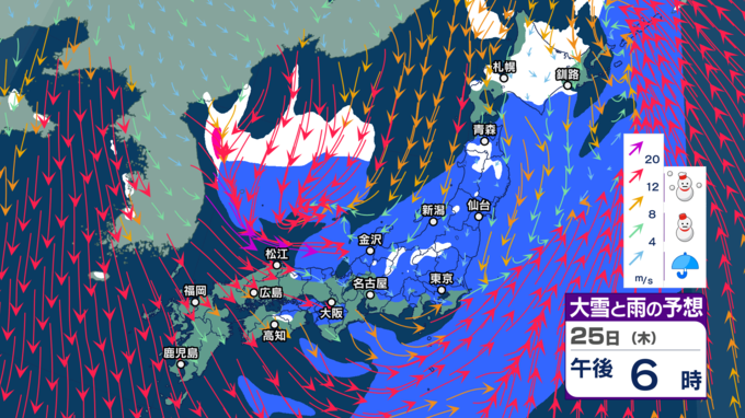 【大雪警戒】26日夕方までの24時間降雪量は東北や関東甲信~中国で最大50cm、九州北部で30cm予想 暴風や暴風雪、高波にも警戒【今後の雨と雪のシミュレーション・24日午後9時更新】 2025年12月24日(水) 21:00 25日(木)の雨・雪と風のシミュレーション