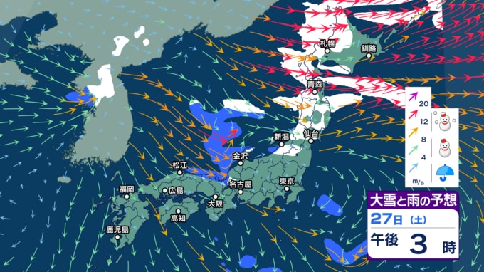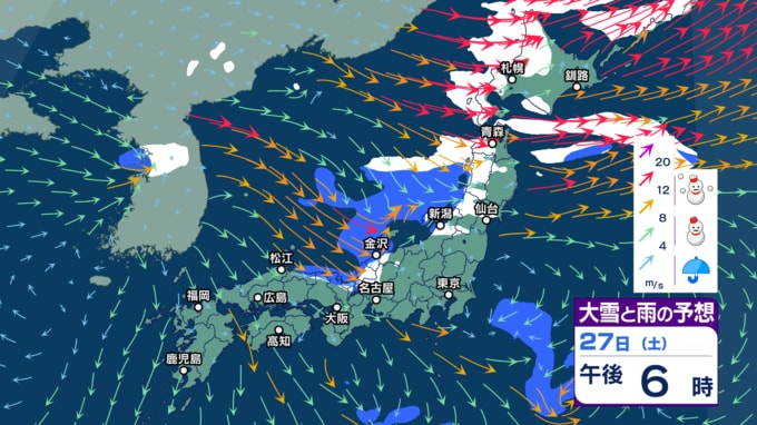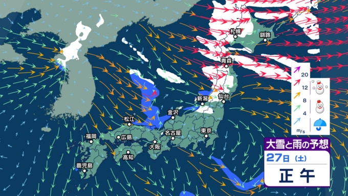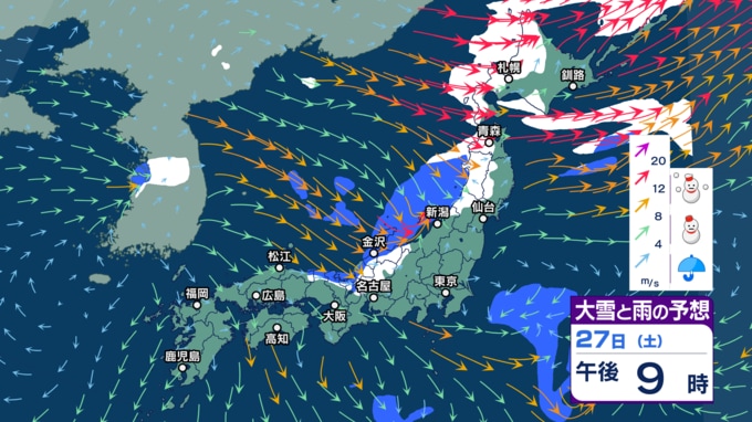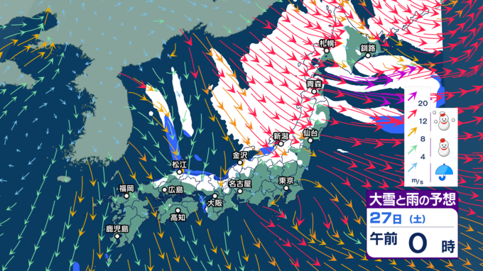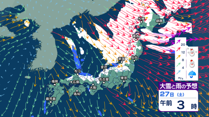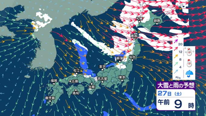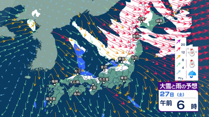 【大雪警戒】26日夕方までの24時間降雪量は東北や関東甲信~中国で最大50cm、九州北部で30cm予想 暴風や暴風雪、高波にも警戒【今後の雨と雪のシミュレーション・24日午後9時更新】 2025年12月24日(水) 21:00 27日(土)の雨・雪と風のシミュレーション