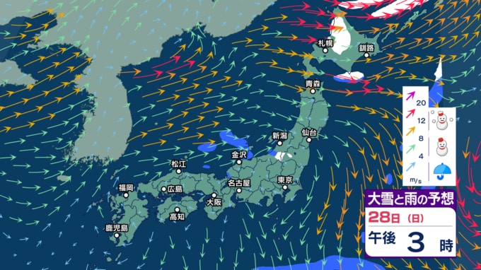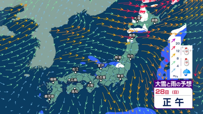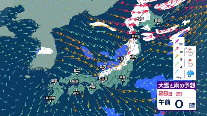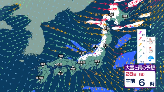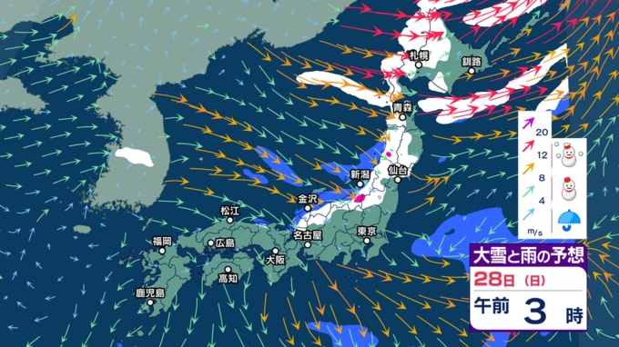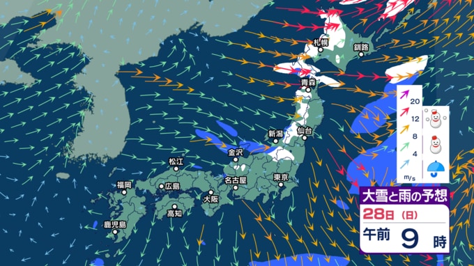 【大雪警戒】26日夕方までの24時間降雪量は東北や関東甲信~中国で最大50cm、九州北部で30cm予想 暴風や暴風雪、高波にも警戒【今後の雨と雪のシミュレーション・24日午後9時更新】 2025年12月24日(水) 21:00 28日(日)の雨・雪と風のシミュレーション