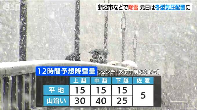 元日は冬型の気圧配置となり、山沿いを中心に雪が降る見込みで、1月1日朝までの12時間に降ると予想される雪の量はいずれも多いところで中越の山沿いで40cm、上・中・下越の平地で15cmなどとなっています。新潟地方気象台は上・中越では土砂災害に、県内全域では風雪や高波などに注意するよう呼び掛けています。