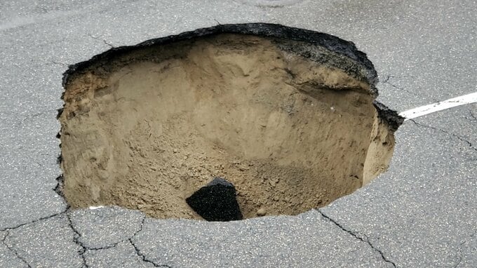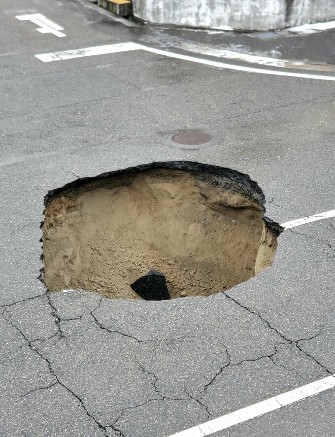 現地の映像を見ると、穴の大きさは直径5mほどで、陥没部分に大型トラックの後輪タイヤが引っ掛かる様子がわかります。
