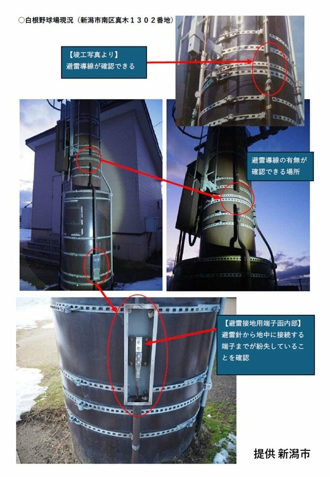 新潟市によりますと、去年12月26日に南区にある白根野球場で点検を行った際、高さ27メートルのナイター照明全6基で避雷針から地面につながる被雷導線が盗まれているのを点検業者が発見しました。被雷導線は避雷針から地上を繋ぐ銅線で、白根野球場ではおよそ60キロの銅線が盗まれたということです。被害相当額はおよそ12万3000円に上ります。
