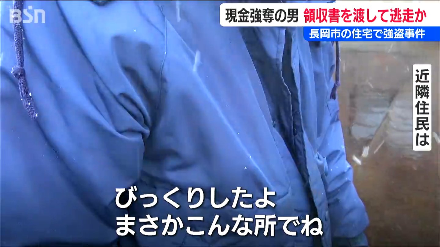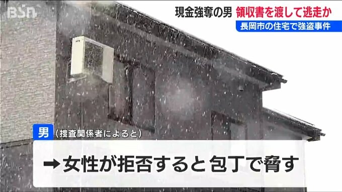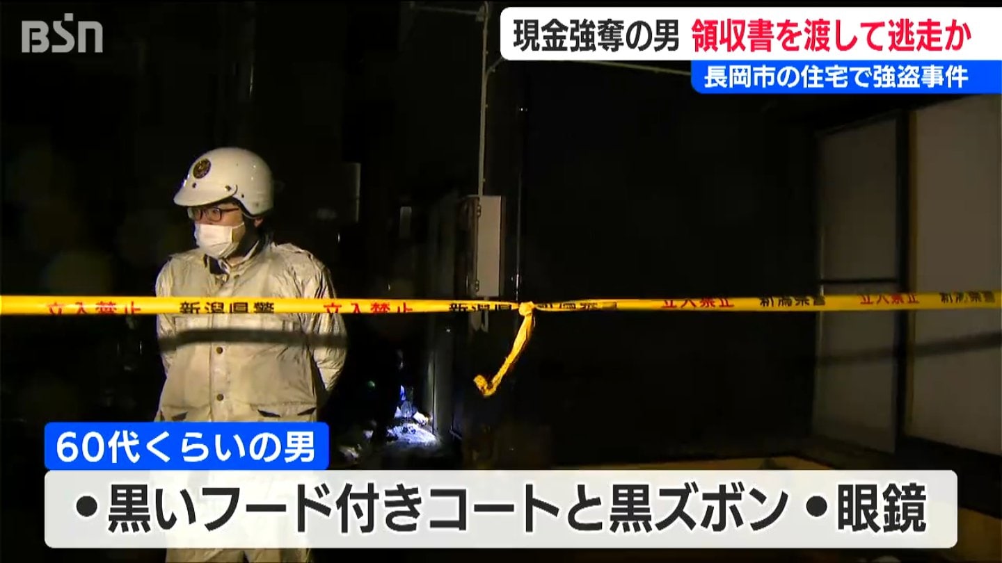 13日、長岡市の住宅で発生した強盗事件で、犯人の男は女性から現金を奪ったあと領収書を書いて現場に残していたことが捜査関係者への取材で分かりました。警察は、領収書を押収して調べを進めています。