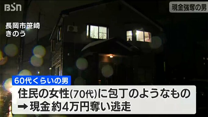 この事件は13日午後、長岡市 笹崎の住宅を60代ぐらいの男が訪問し、70代の女性に包丁のようなものを見せて、現金4万円を奪って逃げたものです。女性にけがはありませんでした。