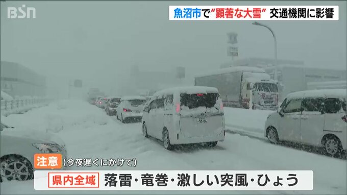 新潟県内では広い範囲で大雪となっていて、魚沼市守門では午前8時に顕著な大雪に関する気象情報が発表されました。道路の渋滞や列車の運転見合わせなど交通機関に影響が出ています。