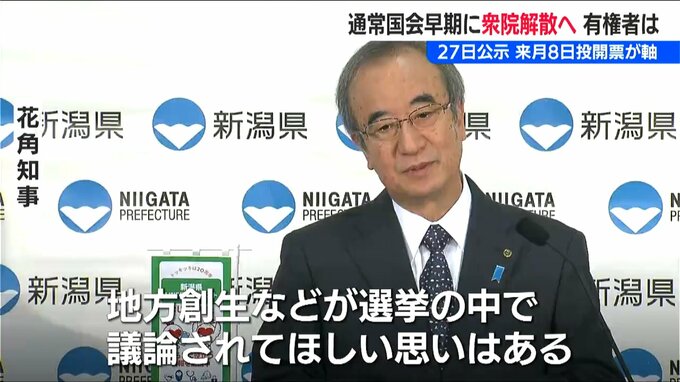 【新潟県 花角 知事】「急速に進む人口減少の中で、活力を維持するのが非常に難しくなってきている。地方創生などが選挙の中で議論されてほしい思いはある」