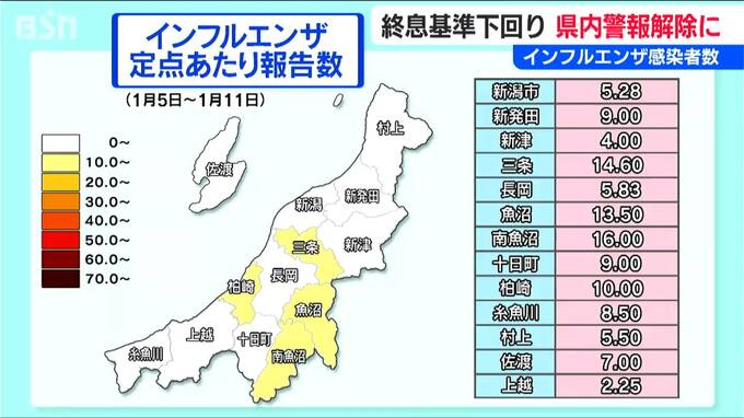 【インフルエンザ警報】を解除 2週続けて感染者数が“収束基準”を下回るも引き続き基本的感染対策の徹底を 新潟県 2026年1月15日(木) 16:21 国内 暮らし・マネー 1月11日までの1週間で、新潟県内の医療機関から報告されたインフルエンザの感染者数は、1医療機関あたり7.64人でした。年末から2週連続で、国の示す警報の終息基準を下回ったことから、県は『インフルエンザ警報』…