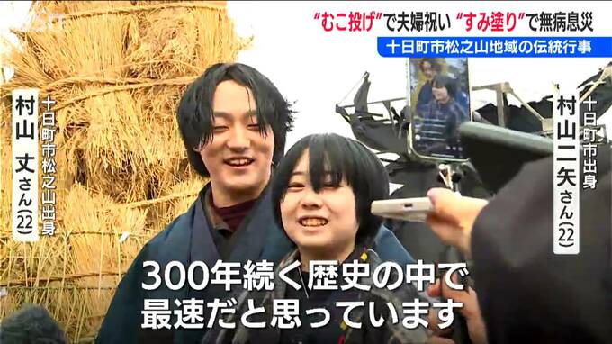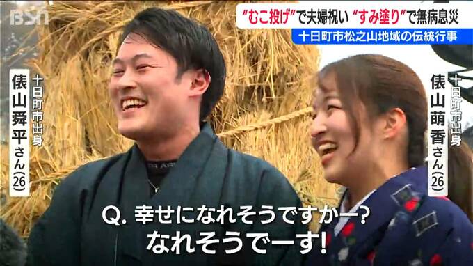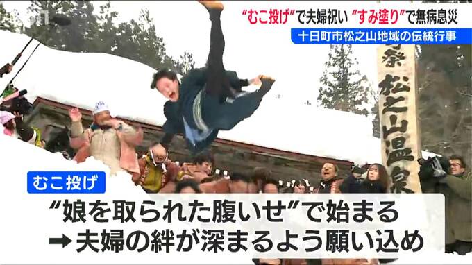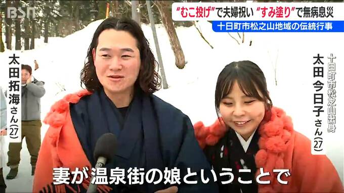 この日も、高さ5mほどある境内から「1、2の3!」と、3人のお婿さんが豪快に投げ飛ばされ、雪まみれになったところに妻が向かいました。