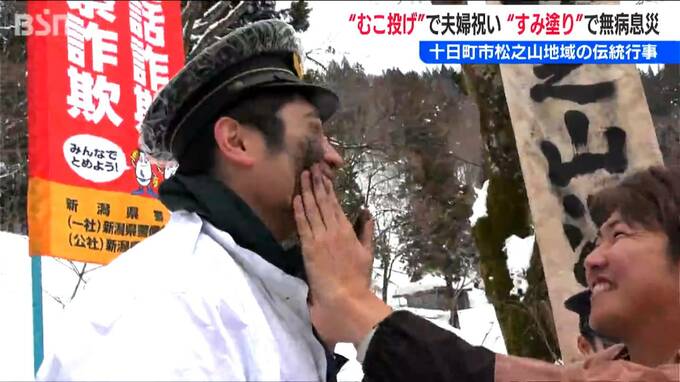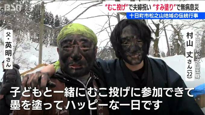 「おめでとうございま~す!」と、お互いの顔に炭を“塗り合う”のが、ここ松之山地域では昔からのならわし。