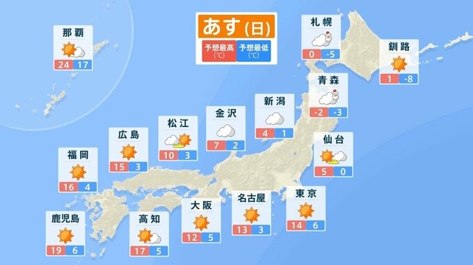 きょう17日は晴れて、この時期としては気温が上がる所が多くなる見込みです。ただ北日本などで大気の状態が不安定となり、降雪量が多くなる所もありそうです。