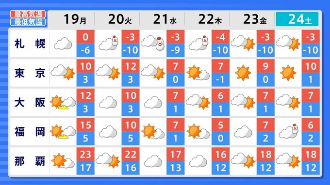 気象庁は19日以降、低気圧が日本海を進む見込みだとしていて、20日頃には日本の東に進み、日本付近には強い寒気が流れ込む見込みだとしています。