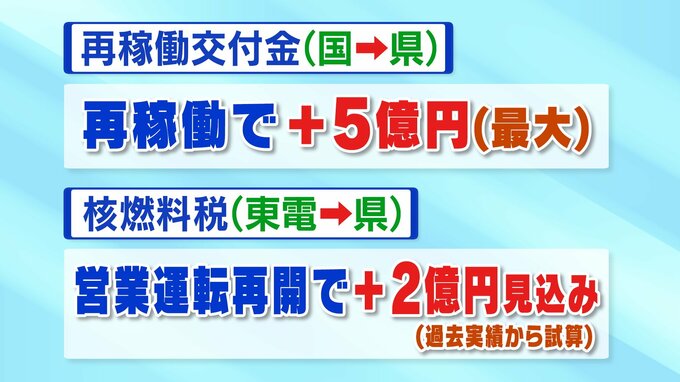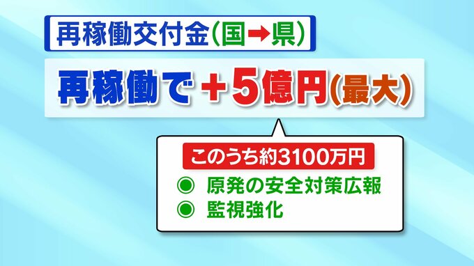 まずは再稼働することで、国から県に新たに入る交付金があります。額は最大で5億円で、県はこのうち、およそ3100万円を原発の安全対策に関する広報や原発の監視に活用することを決めています。