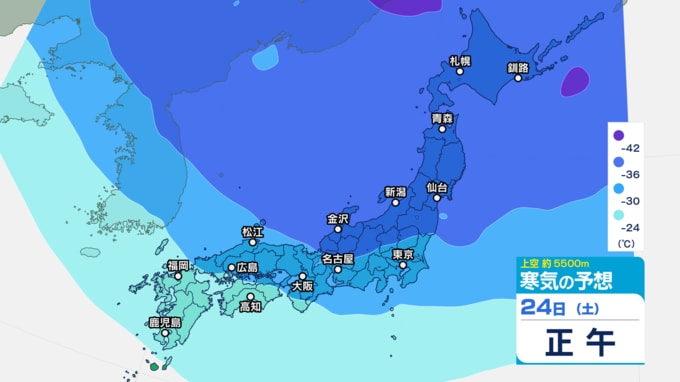 気象台によりますと、日本付近は25日ごろにかけて強い冬型の気圧配置が続き、北陸地方の上空約5000メートルには-36℃以下の強い寒気が断続的に流れ込む見込みだとしています。