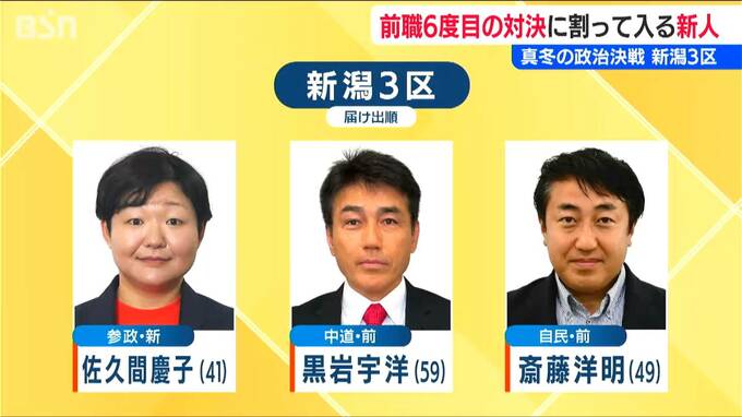 【衆議院選挙】新潟3区 前職6度目の対決に新人が割って入った真冬の政治決戦 それぞれの『第一声』 To view this video please enable JavaScript, and consider upgrading to a web browser that supports HTML5 video 2026年1月27日(火) 18:40 国内 27日に公示された『衆議院選挙』で、新潟3区に立候補したのは、届け出順に 参政党の新人・佐久間慶子さん(41歳) 中道改革連合の前職・黒岩宇洋さん(59歳) 自民党の前職・斎藤洋明さん(49歳) の3人です。