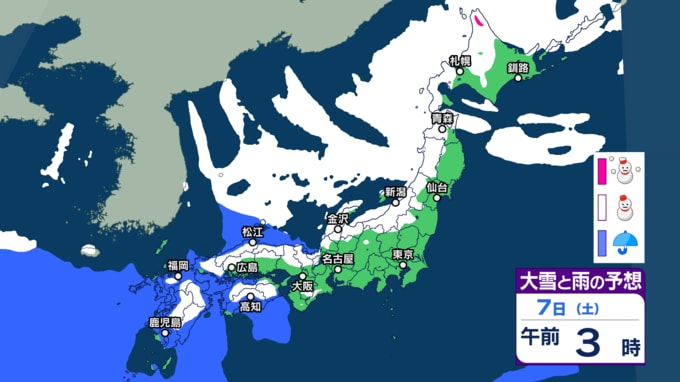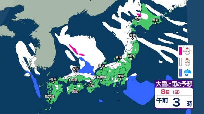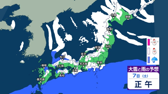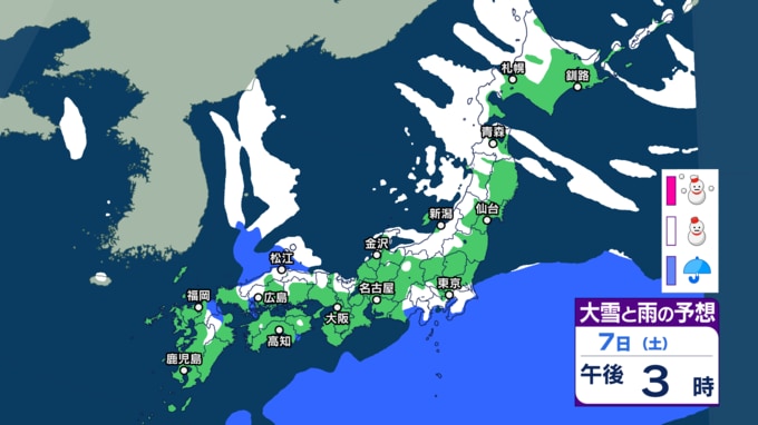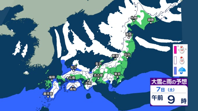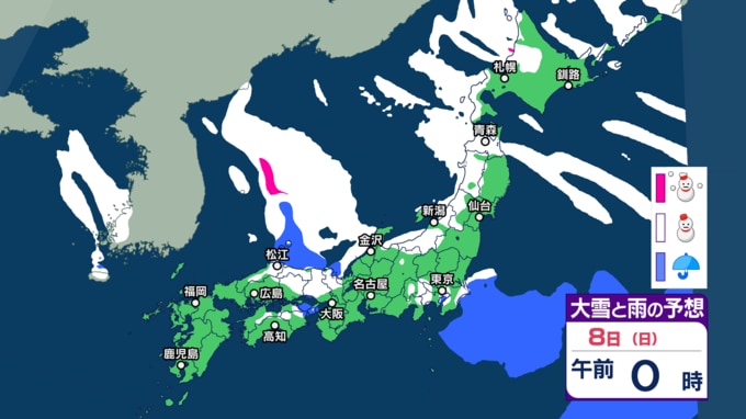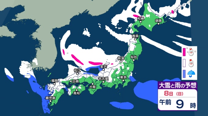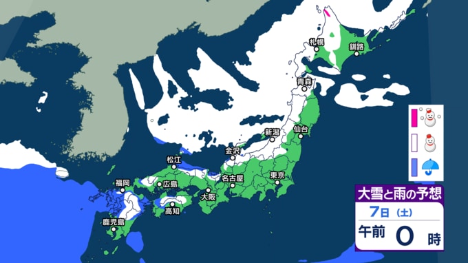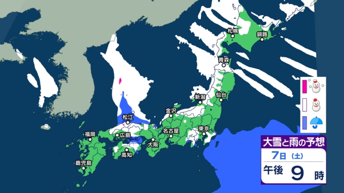 7日以降は日本海側で雪が続く見込みで、さらに四国や九州、近畿、関東など普段あまり雪が降らない所でも雪となる時間帯がありそうです。また8日は日本海側を中心に雪が強まる所がある見込みです。