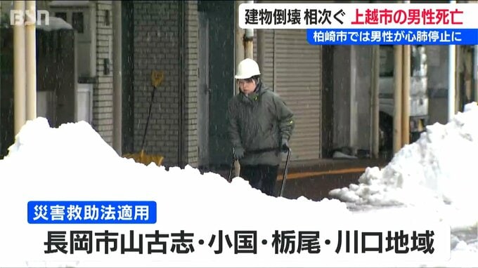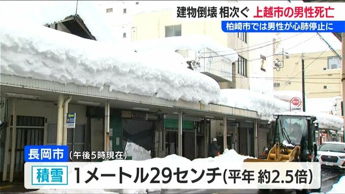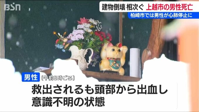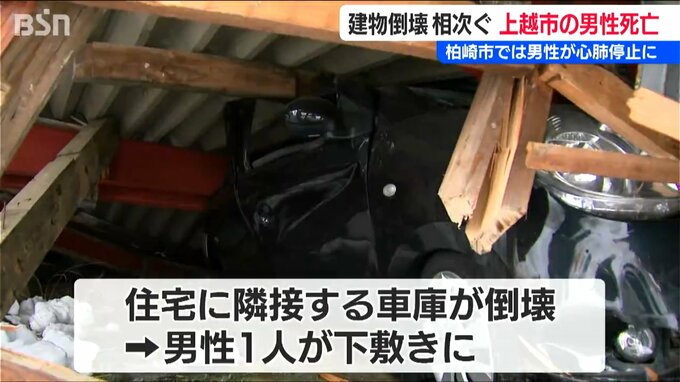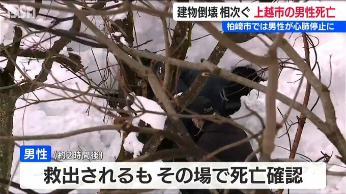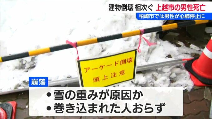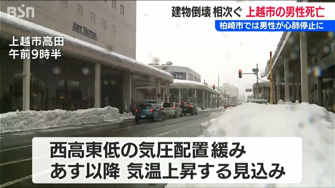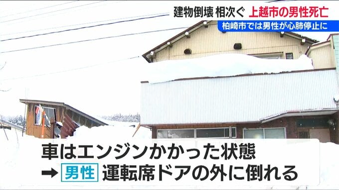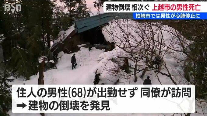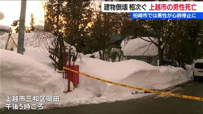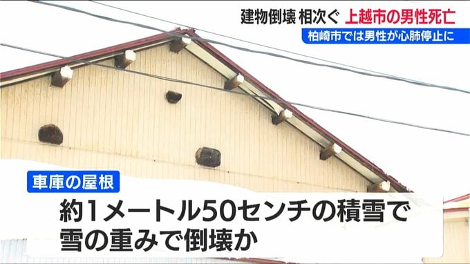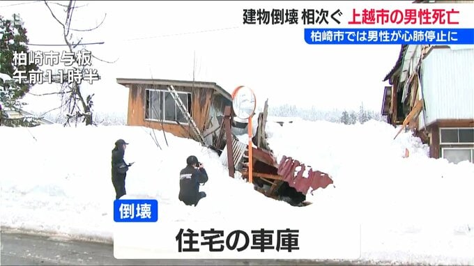 新潟県内では雪の被害が深刻となっています。上越市で住宅が倒壊しているのが見つかり、中から男性が救出されましたが、その場で死亡が確認されました。また、柏崎市では住宅の車庫が倒壊し男性が下敷きとなり、心肺停止の状態となっています。