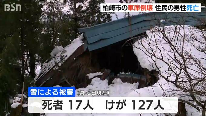 記録的な大雪の影響で雪の被害相次ぐ新潟県 2日までに17人が死亡 127人が負傷 2026年2月4日(水) 12:10 国内 新潟県柏崎市で3日、倒壊した車庫の下敷きとなり心肺停止となっていた男性の死亡が確認されました。男性は、この家に住む54歳の男性と判明しています。倒壊したのは柏崎市与板の住宅の車庫で、3日午前6時ごろ、「…