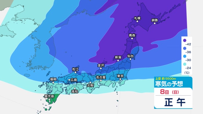 気象台によりますと、日本付近は、8日頃は冬型の気圧配置が強まり、北陸地方の上空約5000メートルには-39℃以下の強い寒気が流れ込む見込みです