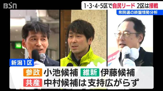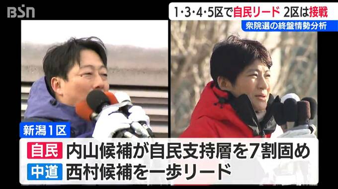 衆院選2026 2区は接戦も1・3・4・5区では自民がリード【衆議院選挙 2026】新潟県内の終盤情勢 2026年2月5日(木) 19:06 国内 暮らし・マネー 新潟1区 自民党の新人・内山航さんが自民支持層の7割を固め、中道改革連合の前職・西村智奈美さんを一歩リードしています。 参政党の新人・小池幸夫さん、日本維新の会の新人・伊藤和成さん、共産党の新人・中村岳夫さんは、支持が広がっていません。