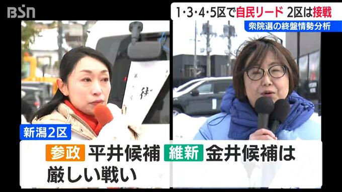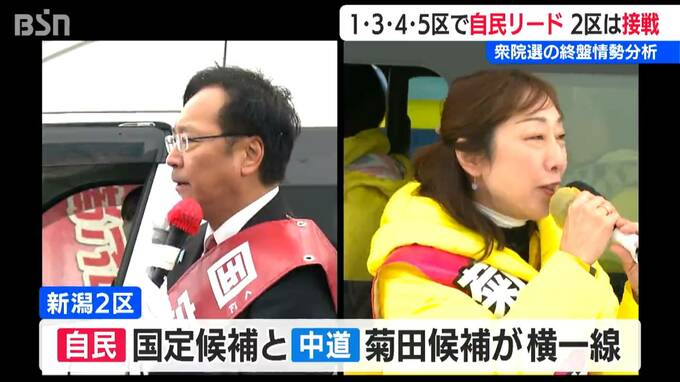 衆院選2026 2区は接戦も1・3・4・5区では自民がリード【衆議院選挙 2026】新潟県内の終盤情勢 2026年2月5日(木) 19:06 国内 暮らし・マネー 新潟2区 自民党の前職・国定勇人さんと、中道改革連合の前職・菊田真紀子さんが横一線。 参政党の新人・平井恵里子さん、日本維新の会の新人・金井典子さんは、厳しい戦いとなっています。