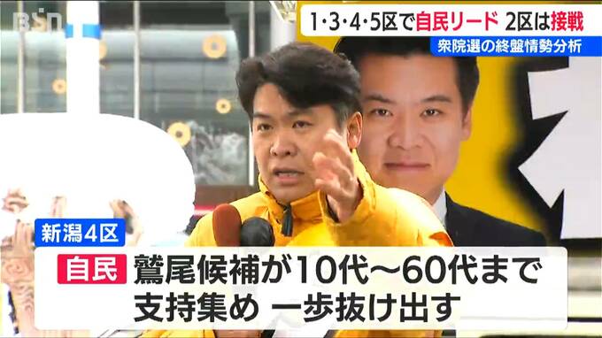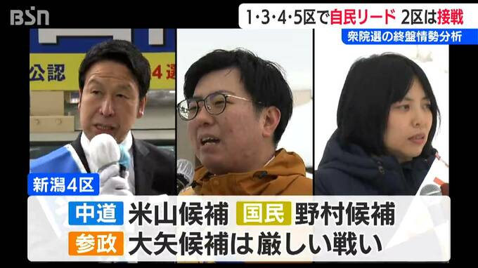 衆院選2026 2区は接戦も1・3・4・5区では自民がリード【衆議院選挙 2026】新潟県内の終盤情勢 2026年2月5日(木) 19:06 国内 暮らし・マネー 新潟4区 自民党の元職・鷲尾英一郎さんが、10代から60代までの層で支持を集めて一歩抜け出しました。 中道改革連合の前職・米山隆一さん、国民民主党の新人・野村泰暉さん、参政党の新人・大矢寿乃さんは、厳しい戦いとなっています。