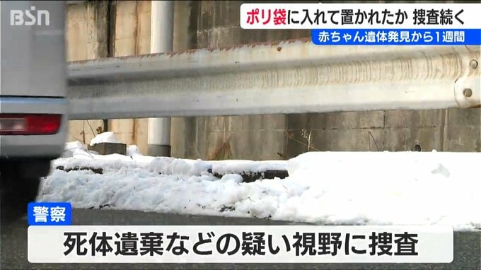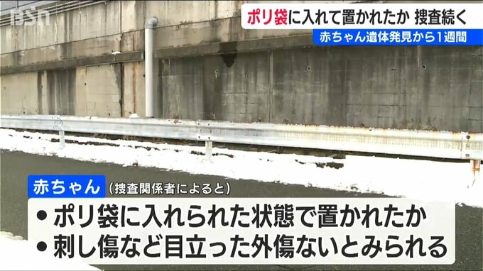 遺体の発見から6日で1週間。捜査関係者への取材で赤ちゃんはポリ袋に入れられた状態で置かれたとみられ、刺し傷などの目立った外傷はないとみられていることが分かっています。