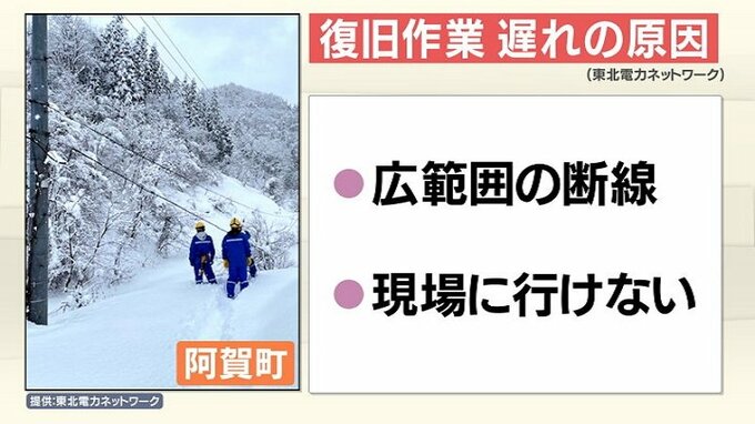 復旧作業の遅れについては、断線が広い範囲で起きている上に、そもそも大雪で復旧現場に行けないことなどを挙げています。