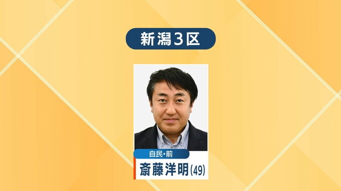 【衆議院選挙・新潟3区】自民・前 斎藤洋明氏(49)が当選確実 2026年2月8日(日) 20:02 国内 2月8日に投票が行われた衆議院議員選挙の新潟3区で、自民党の前職・斎藤洋明氏(49)の当選が確実となりました。 BSN新潟放送では出口調査やこれまでの取材とあわせて斎藤氏の当選は確実だと判断しました。