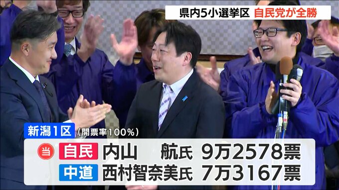 新潟1区は自民党の新人・内山航さんが、8期目を目指した中道の西村さんを下し、初当選を決めました。