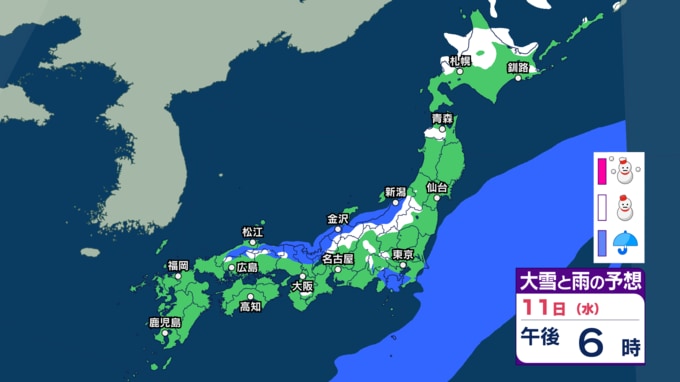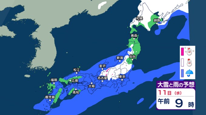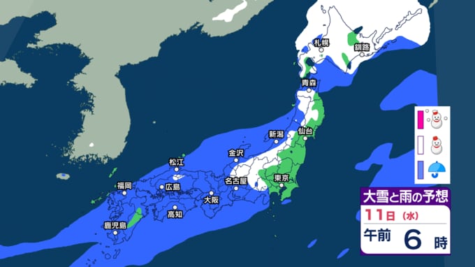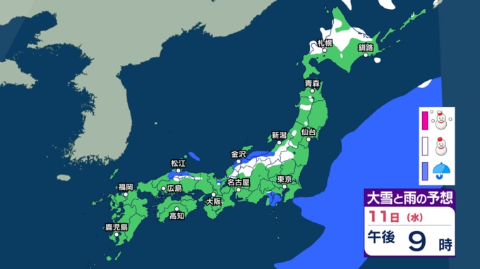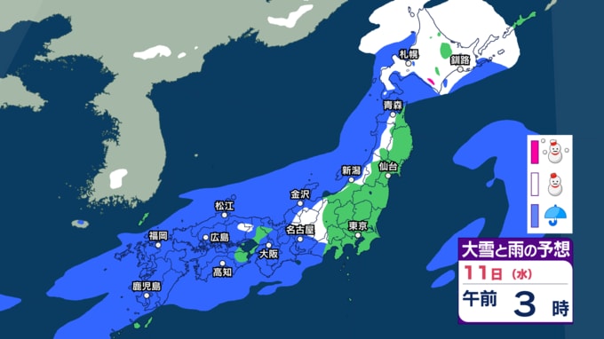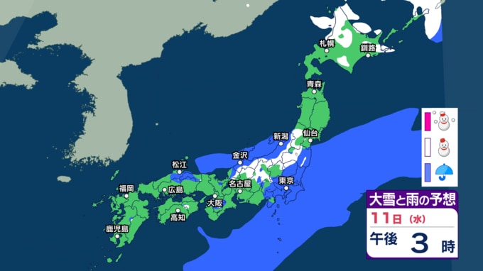 低温の次は“平年よりも高温”に? 北海道~奄美地方が“真っ赤”「高温に関する早期天候情報」 5日間平均気温が平年より2℃以上高く?【16日間天気予報掲載・10日午後3時更新】 2026年2月10日(火) 15:35 11日(水祝)の雨と雪のシミュレーション(3時間ごと)