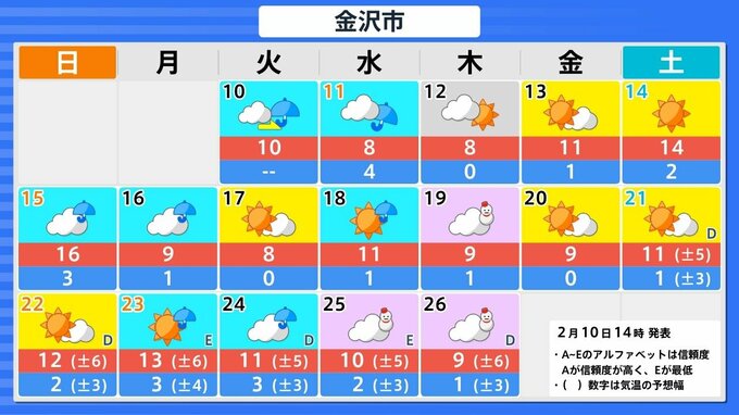 北陸地方の向こう2週間の気温は、寒気の影響を受けにくいため高い日が多く、15日頃からはかなり高くなる可能性があります。