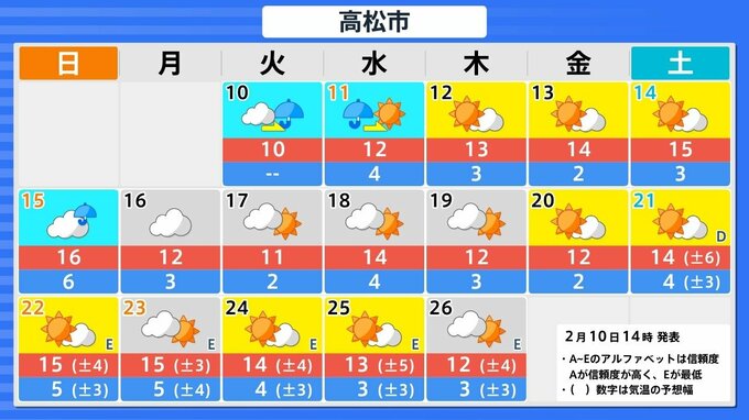 四国地方の向こう2週間の気温は、寒気の影響を受けにくく暖かい空気が流れ込みやすい時期があるため高い日が多く、15日頃からはかなり高くなる見込みです。