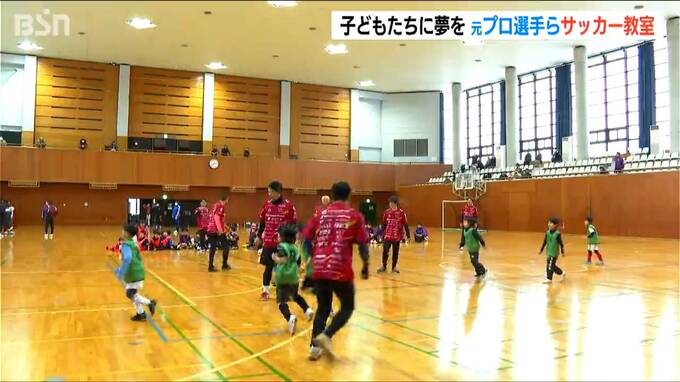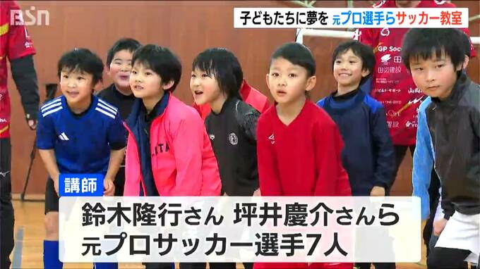 子どもたちに熱い指導をしたのは日本代表やJリーガーとして活躍した鈴木隆行さんや坪井慶介さんら元プロサッカー選手の7人です。