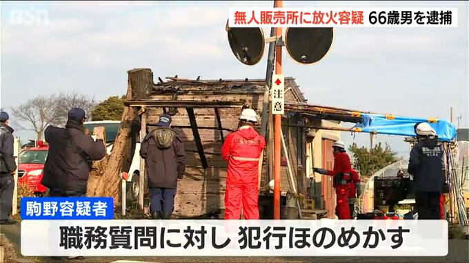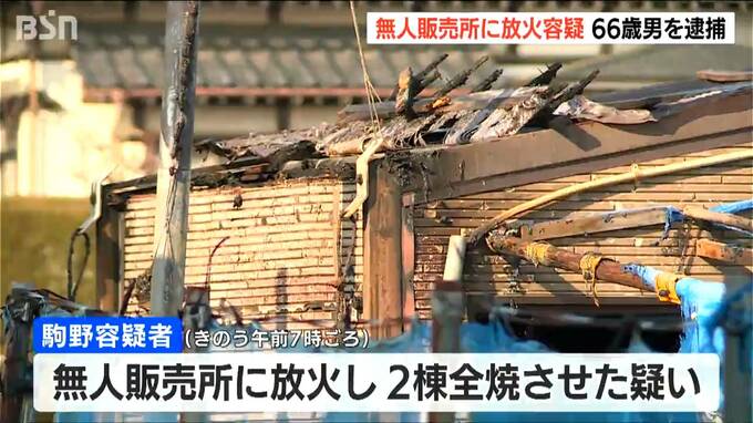 警察によりますと、駒野容疑者は12日午前7時ごろに自宅近くにある無人販売所に火をつけたとして販売所と倉庫を全焼させた疑いが持たれているということです。