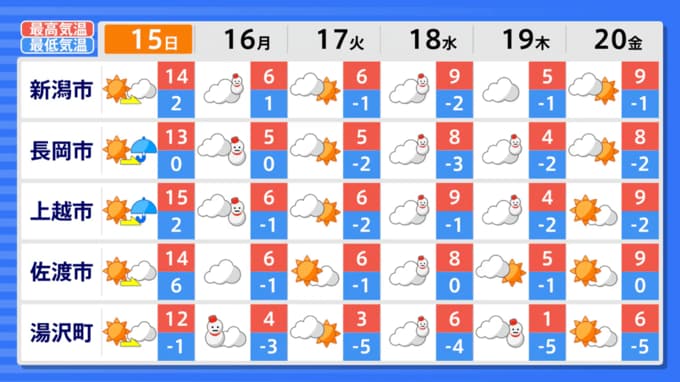 15日の日曜日も晴れそうですが、夕方からは上越と中越を中心に雨の降るところがあり、山沿いの地域では雪になりそうです。